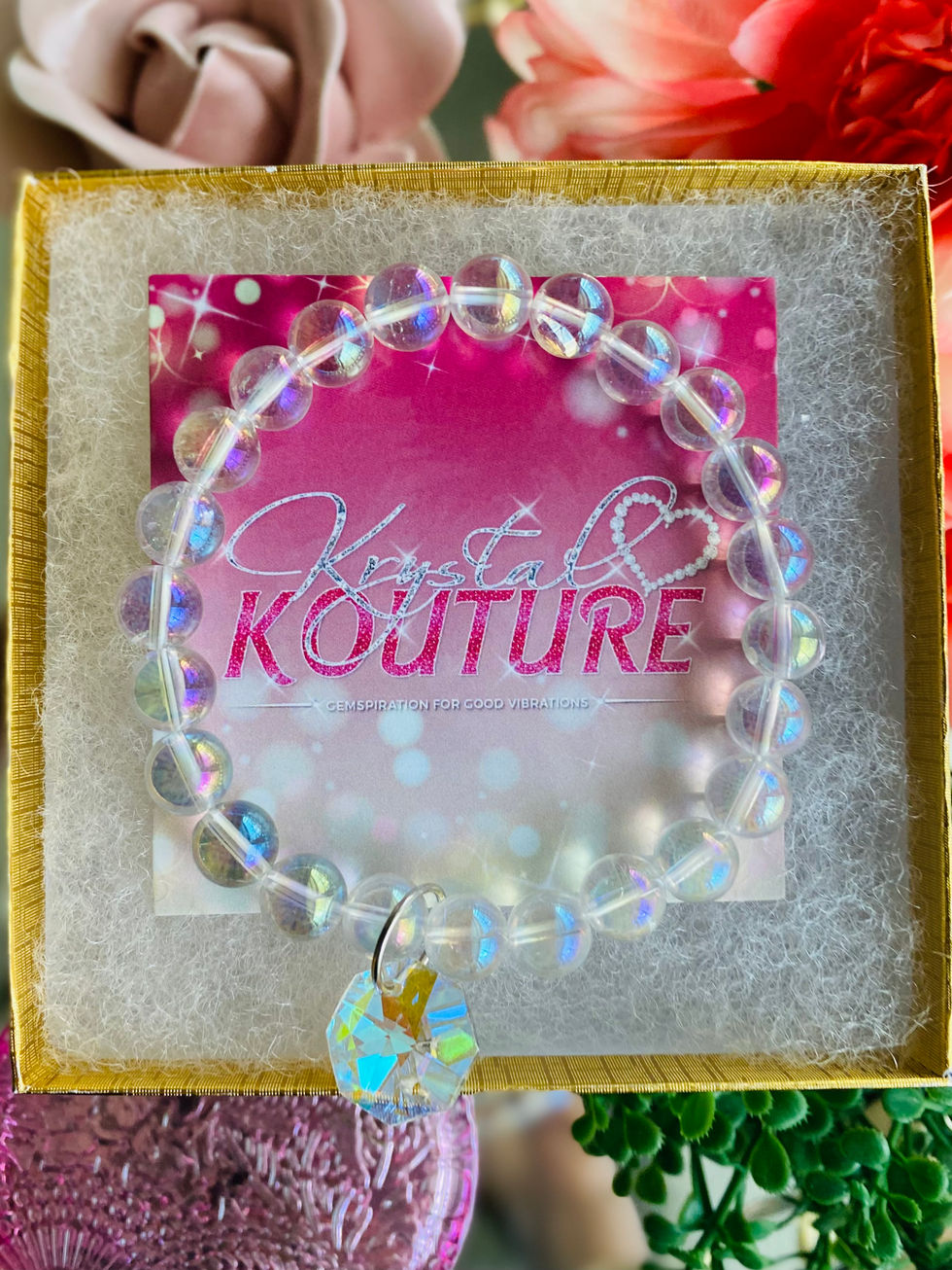 Show your light and sparkle with this 8mm Aura Clear Quartz bracelet, accented by a delicate prism charm that catches the eye. Known as a powerful stone of clarity, amplification, and spiritual balance, Aura Clear Quartz enhances intention and radiates positive energy. Handmade with care, this enchanting bracelet blends healing energy with elegant, fairy-inspired style—perfect for treating yourself or someone special with a gift that adds a touch of magical elegance to special occasions or everyday style.